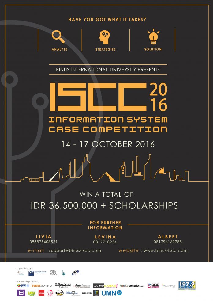 ISCC is being held from 14 to 17 October 2016 in BiNus University International’s JWC campus, located in Jl. Hang Lekir I no IIIa. The participants will spend a night to build their solution in BiNus’ living place, BINUS Square, in Kemanggisan. The events will also have a seminar held by multiple companies and parties, that will also help create the case for the participants to solve. The participants will compete for prizes up to Rp. 37.500.000 in total.