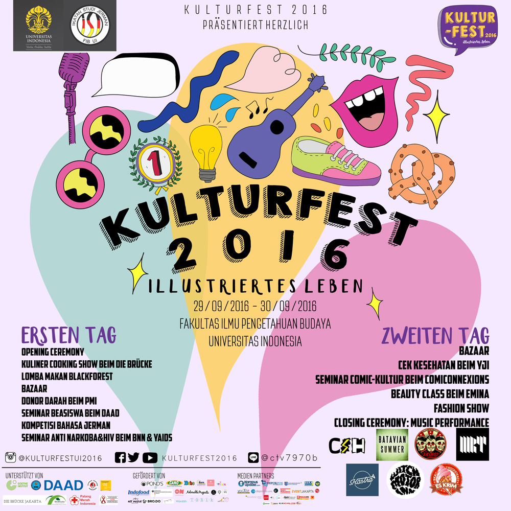 Kulturfest UI 2016 merupakan acara tahunan yang diselenggarakan oleh Ikatan Studi Jerman FIB UI. Adalah sebuah acara pengenalan kebudayaan Jerman kepada masyarakat. Kali ini, Kulturfest UI 2016 mengangkat konsep Komik Kultur dengan tagline “illustriertes Leben” menampilkan karakter dari komik-komik terkenal di dunia, terutama di Jerman.