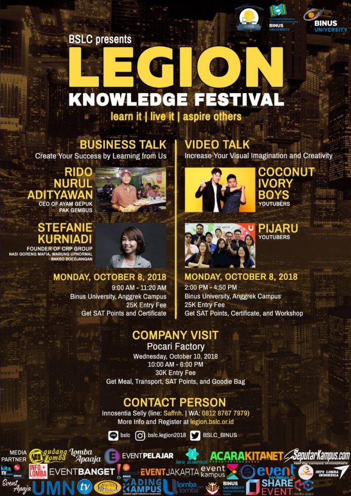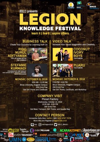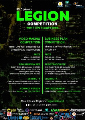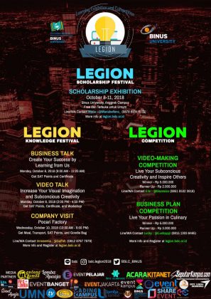 LEGION atau Learning Exhibition and Competition yang bertemakan “Learn it, Live it and Aspire Others”adalah rangkaian acara yang terdiri dari kompetisi, pameran beasiswa, seminar dan kunjungan perusahaan.