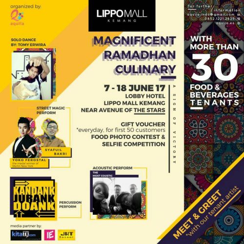 Langsung catat tanggalnya, buat janji dengan keluarga/teman/pasangan kamu dan jadi 50 pengunjung pertama untuk langsung mendapatkan gift voucher yang dapat langsung kamu belanjakan di area bazar ‘MAGNIFICENT RAMADHAN’.