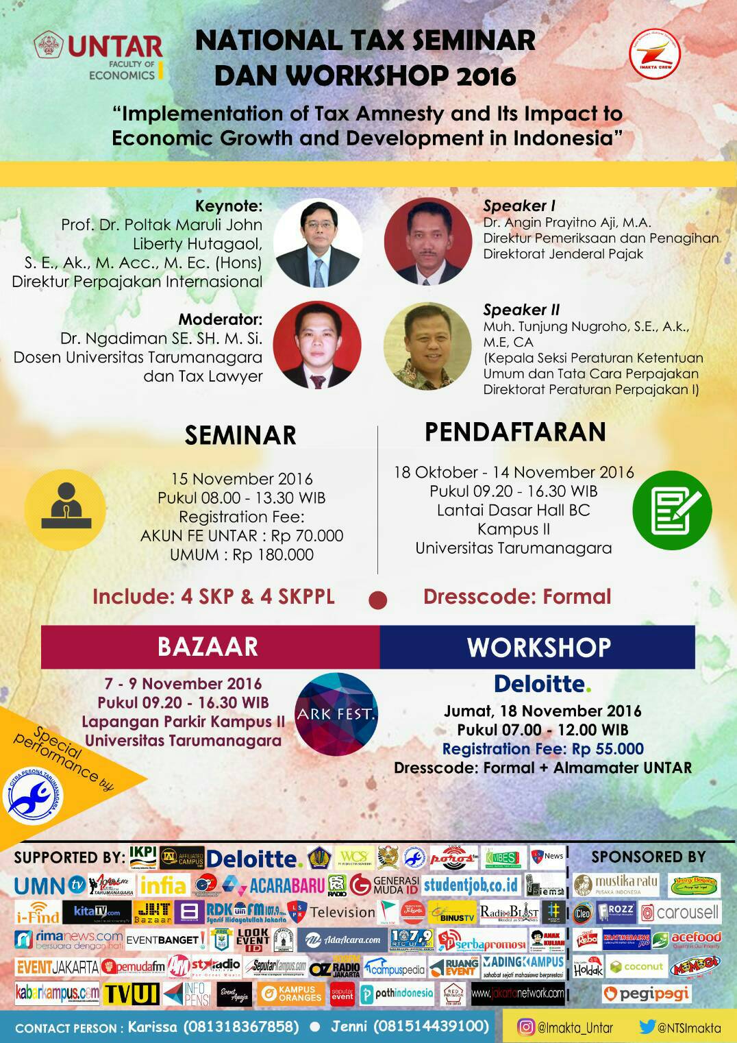 Acara ini ditujukan kepada mahasiswa dan mahasiswi Fakultas Ekonomi Universitas Tarumanagara dan Umum yang diadakan pada hari Selasa tanggal 15 November 2016 pukul 08.30-13.00 WIB (National Tax Seminar) dan 18 November 2016 pukul 07.00- 14.00 WIB (Workshop).Berlokasi di Auditorium Lt. 8 Gedung M, Universitas Tarumanagara Kampus 1(National Tax Seminar), Deloitte (Workshop).
