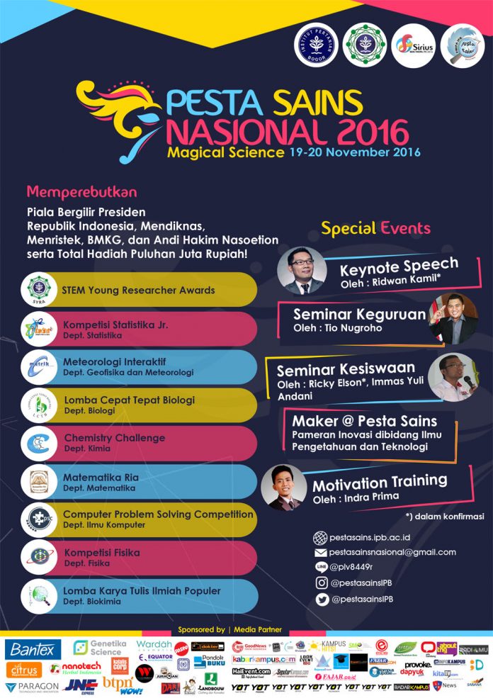 Institut Pertanian Bogor mempersembahkan Pesta Sains Nasional 2016. Ajang sains tahunan terbesar IPB ini mengundang siswa SMA se-Indonesia untuk berkompetisi dan memenangkan berbagai perlombaan sains pada 19-20 November 2016.