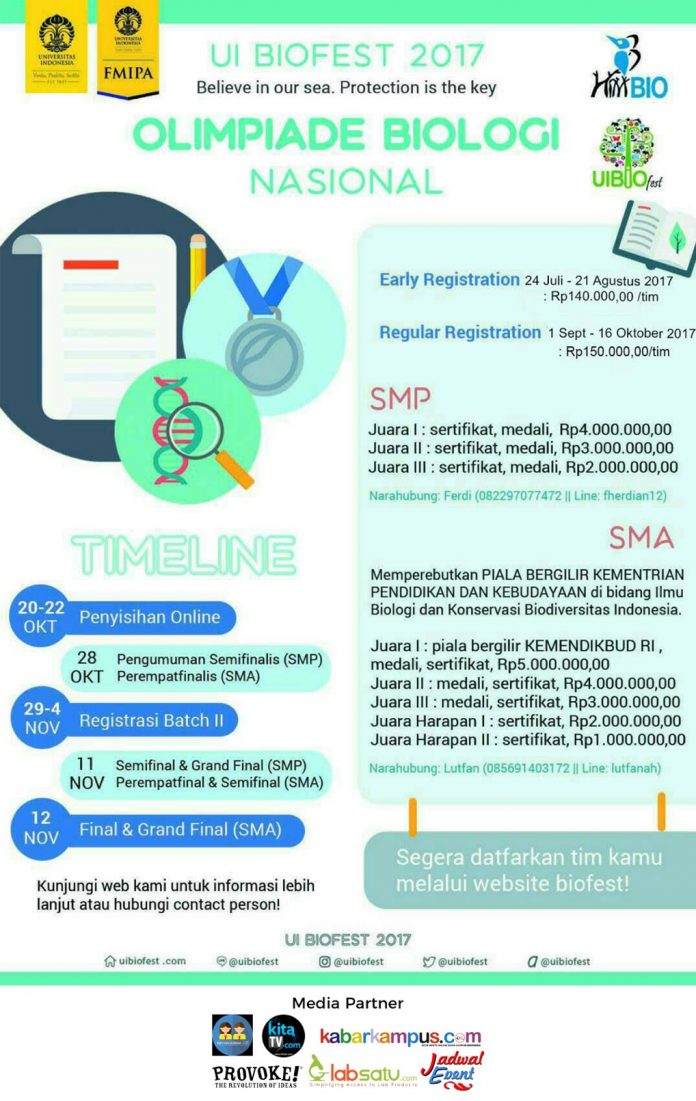 Bagi kalian yang duduk di bangku SMP/sederajat dan SMA/sederajat yuk join Olimpiade UI Biofest 2017! ?‍?