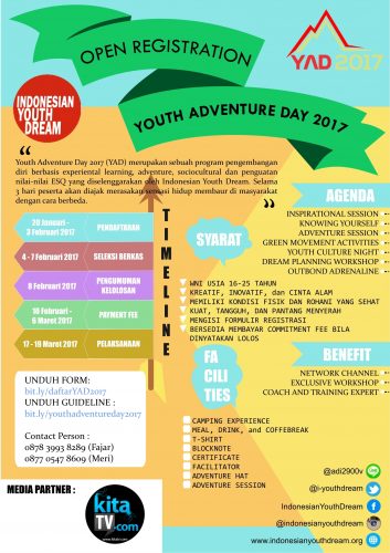 YAD 2017 akan berlangsung mulai dari tanggal 17 – 19 Maret 2017 bertempat di Kebun Buah Mangunan, Imogiri, Kab.Bantul, Yogyakarta. Acara tahunan IYD ini pada tahun 2017 hanya akan menerima 150 Delegasi pilihan dari seluruh Indonesia dan semua latar belakang berhak mengikutinya. Bagi kalian anak muda Indonesia segera daftarkan dirimu dengan mengunduh formulirnya di bit.ly/daftarYAD2017 dan pastikan dirimulah yang akan mendapatkan kesempatan terbaik ini. Jadilah salah satu dari 150 pemuda beruntung yang berkesempatan untuk berkolaborasi bersama anak-anak muda pilihan Indonesia demi mewujudkan mimpi-mimpi terbaik anak muda Indonesia. Untuk ketentuan dan syarat pendaftaran dapat dilihat di bit.ly/youthadventureday2017