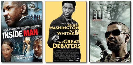 Salah satu aktor Hollywood kenamaan yang masuk dalam daftar aktor dengan gaya khas di poster film adalah Denzel Washington. Film-filmnya seperti Remember The Titans, The Hurricane, Training Day dan banyak lainnya selalu menampakkan gaya yang khas yakni selalu menghidari kontak mata dengan penonton. Entah apakah Denzel malu dengan kamera atau memang ingin dicitrakan sebagai sosok yang cool namun gayanya ini hampir semuanya sama di semua film yang menayangkan dirinya sebagai pemeran utama.