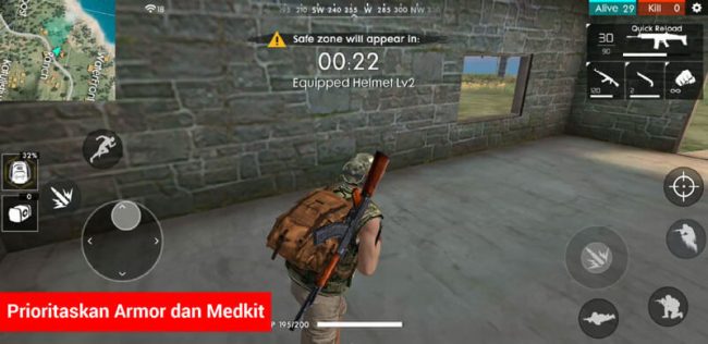 Di posisi ketiga taktik Free Fire untuk pemula yang perlu diperhatikan adalah utamakan mencari armor daripada senjata. Karena kita lebih baik berfokus untuk bertahan hidup dulu ketimbang menyerang musuh. Setelah kamu cukup dengan armor, kamu bisa mulai berburu senjata terbaik yang bisa kamu diandalkan di Free Fire untuk serangan melawan musuh. Akan baik lagi jika kamu bisa menyeimbangkan antara armor dan juga senjata, sehingga defensif dan ofensifmu cukup untuk booyah.