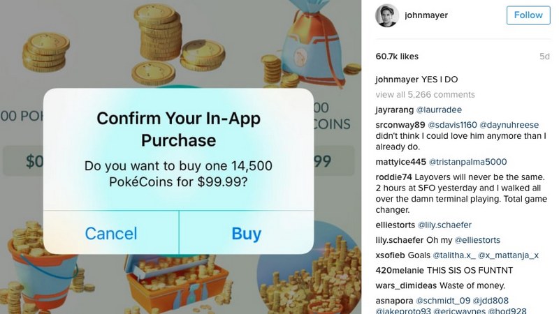 Mantan pacar Taylor Swift ini sudah menunjukan bagaimana keseriusannya dalam bermain Pokemon GO melalui akun Instagramnya. John Mayer bahkan mengunggah sebuah screen capture menunjukan transaksi dari pembelian koin Pokemon GO seharga Rp1,3 juta rupiah. Dengan caption “YES I DO” John ini seakan menunjukan bagaimana dirinya sangatlah serius dalam berburu berbagai macam monster Pokemon di dunia nyata.