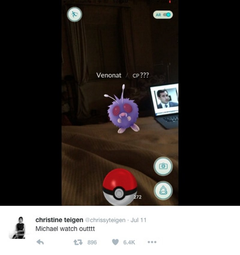 Model cantik Chrissy Teigen pun tak luput dari kehebohan demam Pokemon GO yang melanda dunia. Melalui akun Twitternya, Teigen mengunggah screencapture yang menunjukan dirinya yang sedang menangkap Pokemon Venonat dalam kamarnya.