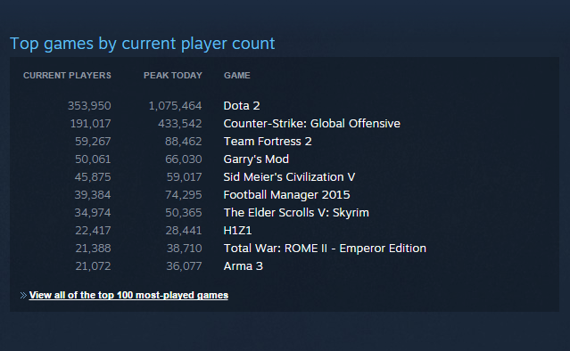 Sebagaimana diberitakan di Steam dan halaman Game Stats, Counter Strike: GO berada di peringkat kedua, dengan jumlah player jauh dibawah Dota 2, dengan 433.542 player.