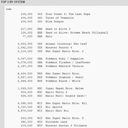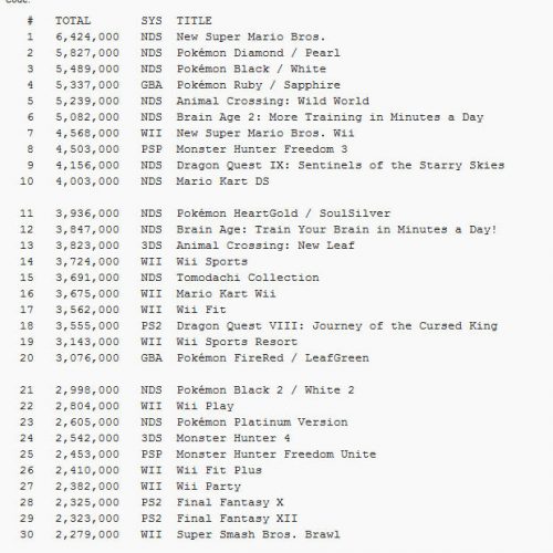 Majalah game Jepang Famitsu telah menerbitkan daftar game terlaris di negara itu dari tanggal 1 Januari 2001 hingga 29 September 2013. Nintendo mendominasi. Ada beberapa kejutan lainnya, terutama ketika Anda mengurai daftar tersebut di bagian platform dan melihat betapa buruk rekor Xbox di Jepang.