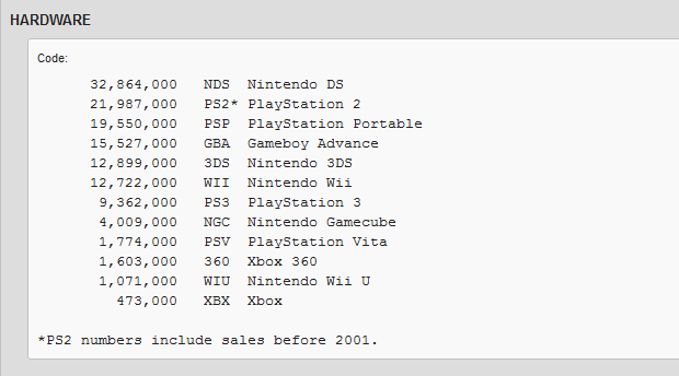 Atau lihatlah penjualan perangkat kerasnya untuk mengetahui bahwa penjualan PSP adalah tepat berada di bawah penjualan PS2. Atau juga untuk mengetahui bahwa hanya ada satu game PS3 yaitu Final Fantasy XIII yang memecahkan rekor terjual di atas satu juta kopi (sementara sekuelnya hanya terjual kurang dari setengah penjualan game pertamanya).