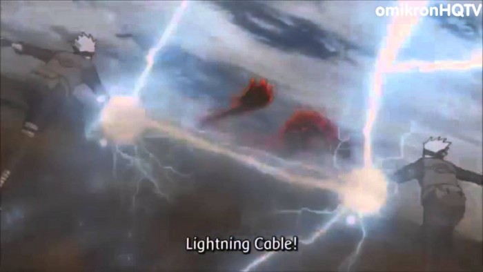 chidori - 2Dengan menggunakan satu tambahan kloning bayangan (shadow clone), masing-masing Kakashi akan menggunakan Chidori, dimana kemudian Chidori tersebut disambungkan satu sama lain. Ketika Chidorinya tersambung, sambungannya tersebut dapat memotong benda apapun, seperti tangan chakra milik Tailed Beast.