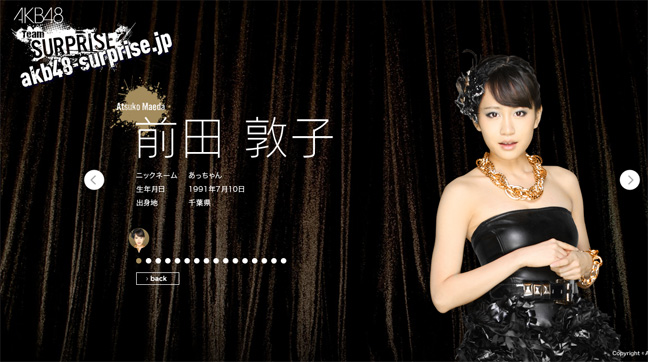 Atsuko Maeda kembali bergabung dengan AKB48? Beberapa saat yang lalu, Kyoraku Co., Ltd meluncurkan situs PachiSuro (Pachinko Slot) yang menampilkan AKB48 Team Surprise. Satu hal yang mengejutkan adalah, dalam bagian Members di situs tersebut, kita dapat melihat secara jelas bahwa mantan ace dari AKB48, Atsuko Maeda masih menjadi center dari Team Surprise – meskipun ia telah lulus dari AKB48 tahun lalu.