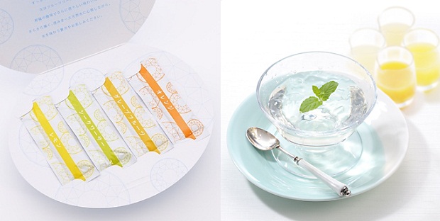 Empat gelas water jello dijual dalam satu set dengan harga 1.050 yen dan hadir dengan empat pak saus buah: lemon, orange, grapefruit, dan shikwasa (sitrus Okinawa).
