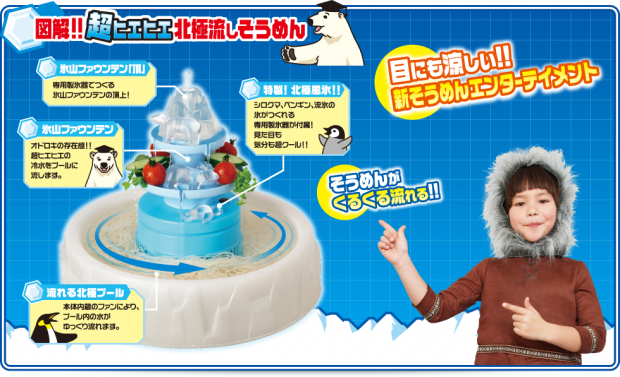 Hidangan ini nampak dipenuhi oleh budaya Jepang yang tertanam di dalamnya, namun tidak berarti Anda tidak dapat menyantapnya sambil bersenang-senang. Berkat Takara Tomy Arts, kini terdapat sebuah alat penghidang sōmen yang imut dan menyenangkan. Pada dasarnya alat ini adalah sebuah miniatur air terjun untuk Anda menyajikan Sōmen, namun tersedia juga cetakan plastik berbentuk penguin dan beruang kutub untuk mencetak es supaya hidangan ini dapat tersaji dengan lebih dingin. Jadi Anda akan merasa menyantap Sōmen ditemani dengan dua mahluk kutub tersebut, dan tentunya Anda akan dapat menyantap hidangan ini sembari bersenang-senang.