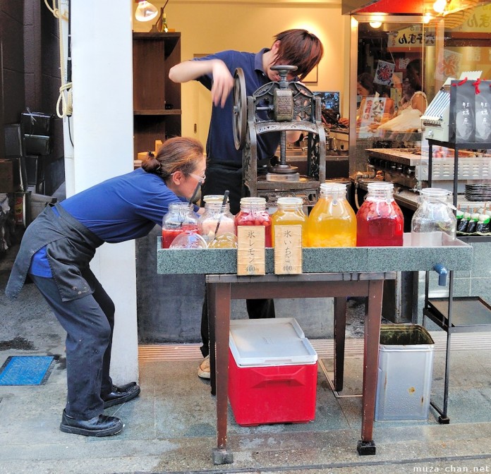 Dalam mesin es serut tua, pisau-pisau pemotongnya beroperasi menggunakan engkol yang diputar menggunakan tangan dan, walaupun kini mesin tersebut sudah sangat langka, kita masih dapat menemukan mereka di daerah-daerah tradisional, seperti yang terlihat dalam foto di bawah ini, difoto di jalan Omotesando dari Miyajima. Dan jika kita perhatikan baik-baik, serutan es yang dihasilkan dari mesin itu lebih lembut dan halus, jauh lebih baik daripada yang dihasilkan dengan menggunakan mesin elektrik modern.