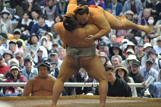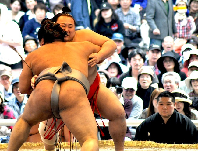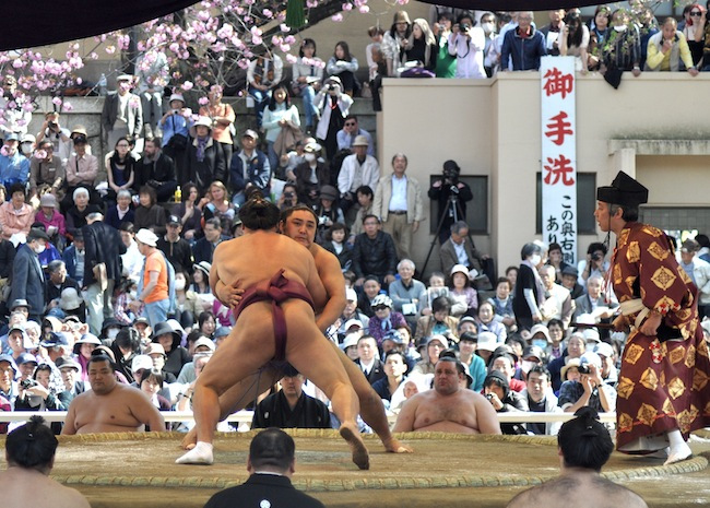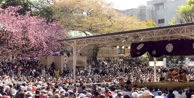 Pada bulan April, olahraga sumo akan kembali ke akarnya di Kuil Yasukuni dengan sebuah acara luar ruangan. Pada zaman dahulu, sumo umumnya diadakan di luar ruangan di berbagai kuil dan candi atau di hadapan kumpulan petinggi yang tengah berkumpul seperti shogun, daimyo (tuan tanah), bahkan Kaisar.