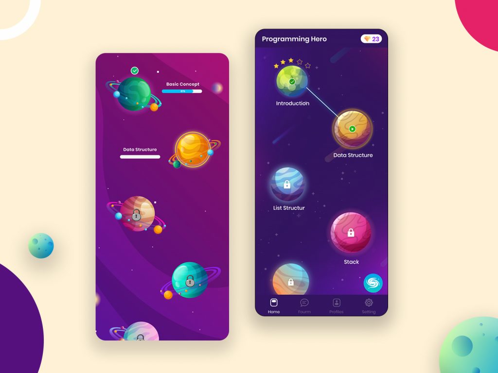 Tampilannya semakin menarik karena dihasilkan dengan tema luar angkasa. Programming Hero juga menawarkan kursus dalam pengembangan web dengan teknologi terkini dan pengembangan aplikasi smartphone pun sedang berproses.