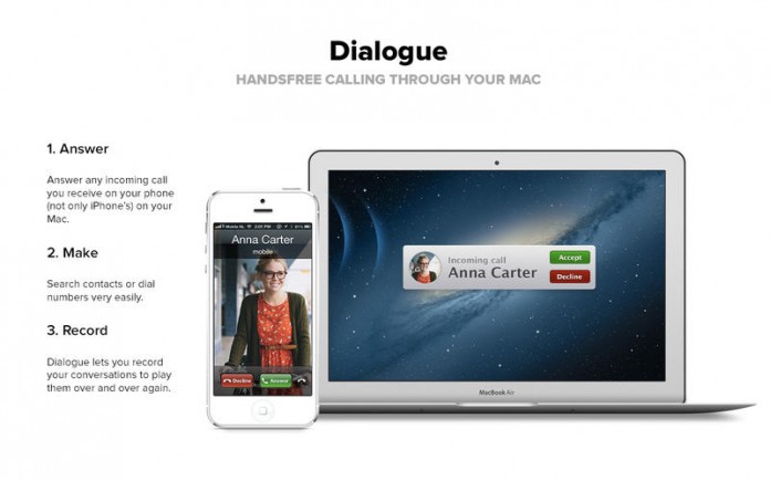 Menurut The Verge, Mac App Store kini menyediakan sebuah aplikasi OS Mac dengan nama Dialogue. Tujuannya adalah untuk menciptakan sebuah link virtual antara smartphone dan desktop menggunakan dukungan Bluetooth. Walaupun begitu, layanan ini tidak terbatas hanya pada iPhone saja, dan kabarnya kompatibel dengan hampir semua model smartphone termasuk perangkat Android dan Windows Phone. Di menu bar Mac, program tersebut menunggu dengan sabar untuk mengalihkan panggilan dari ponsel Anda ke komputer Anda. Dialogue juga memungkinkan Anda untuk membuat panggilan telepon keluar.